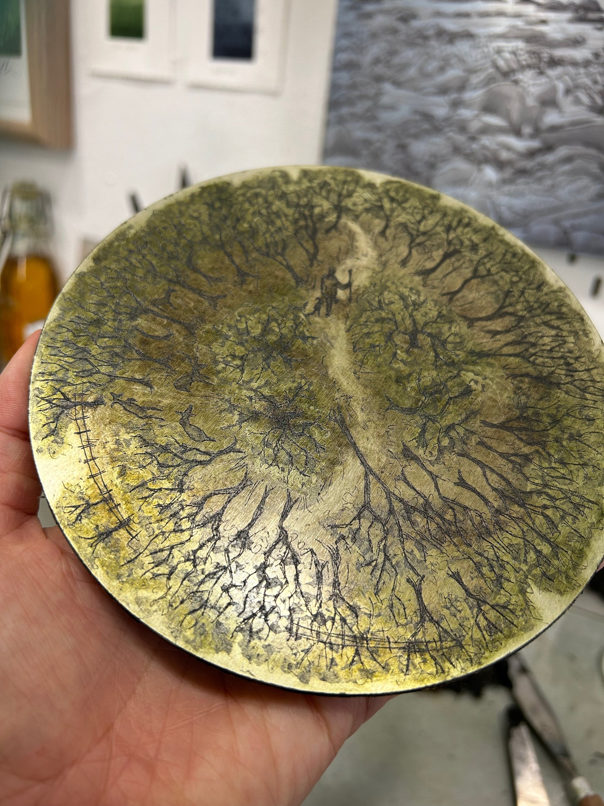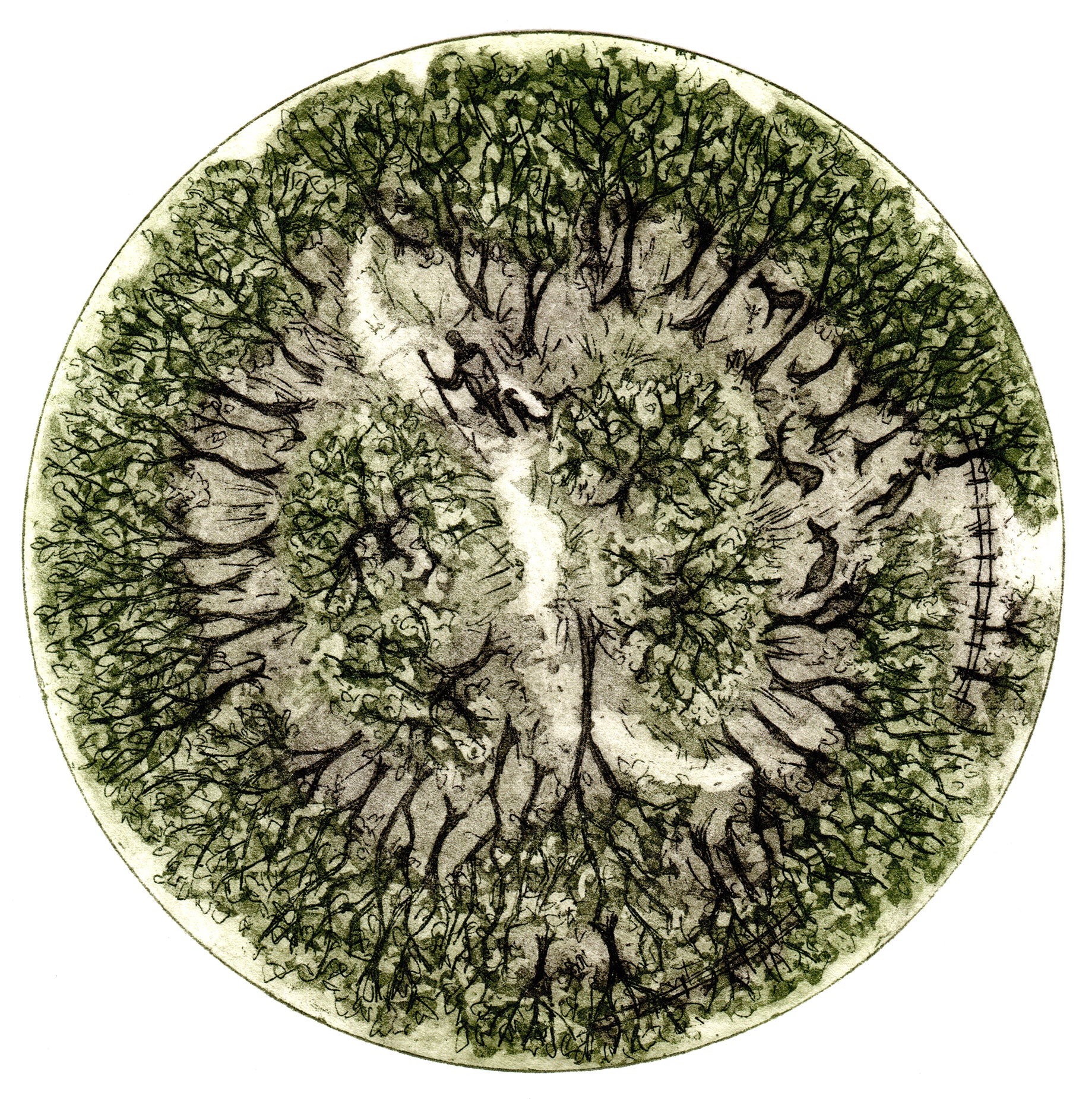 A coloured, tonal etching of a journey through a wood. The lone figure walks so quietly that the deer are emerging from the trees to watch it pass by. The world is so frantic and stressful sometimes that it is important to value moments of peace and silence. That is what I am seeking to portray in this print.