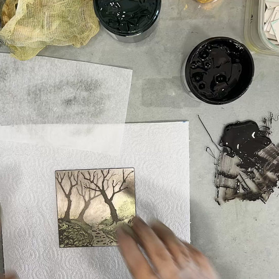 A hand printed etching of a misty path inspired by ramblings through the countryside.
